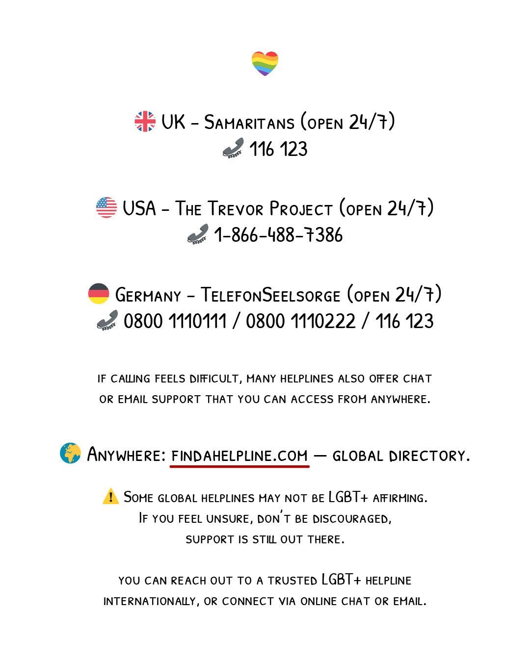 If you ever feel unsure or need guidance, please reach out to a trusted adult or an LGBTQ+ support organization. You’re not alone! (Please see contacts below 💛)